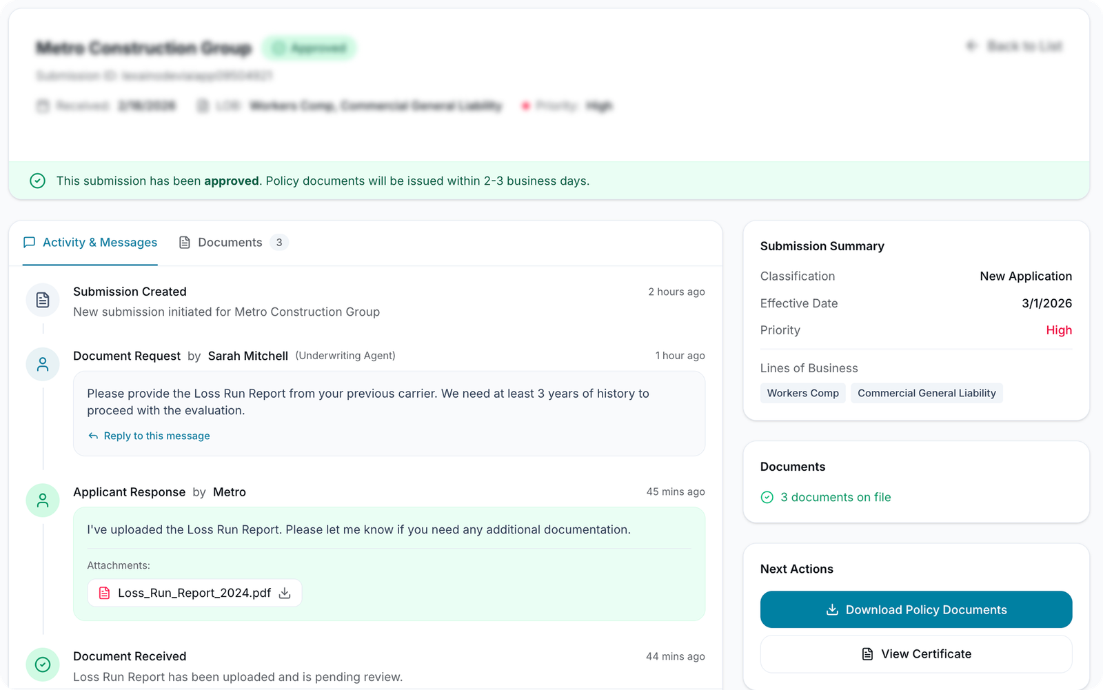 Eliminate email communication entirely with a centralized agent portal. Agents gain direct submission capabilities, access to their entire book of business, and real-time visibility into all interactions-replacing email workflows completely.