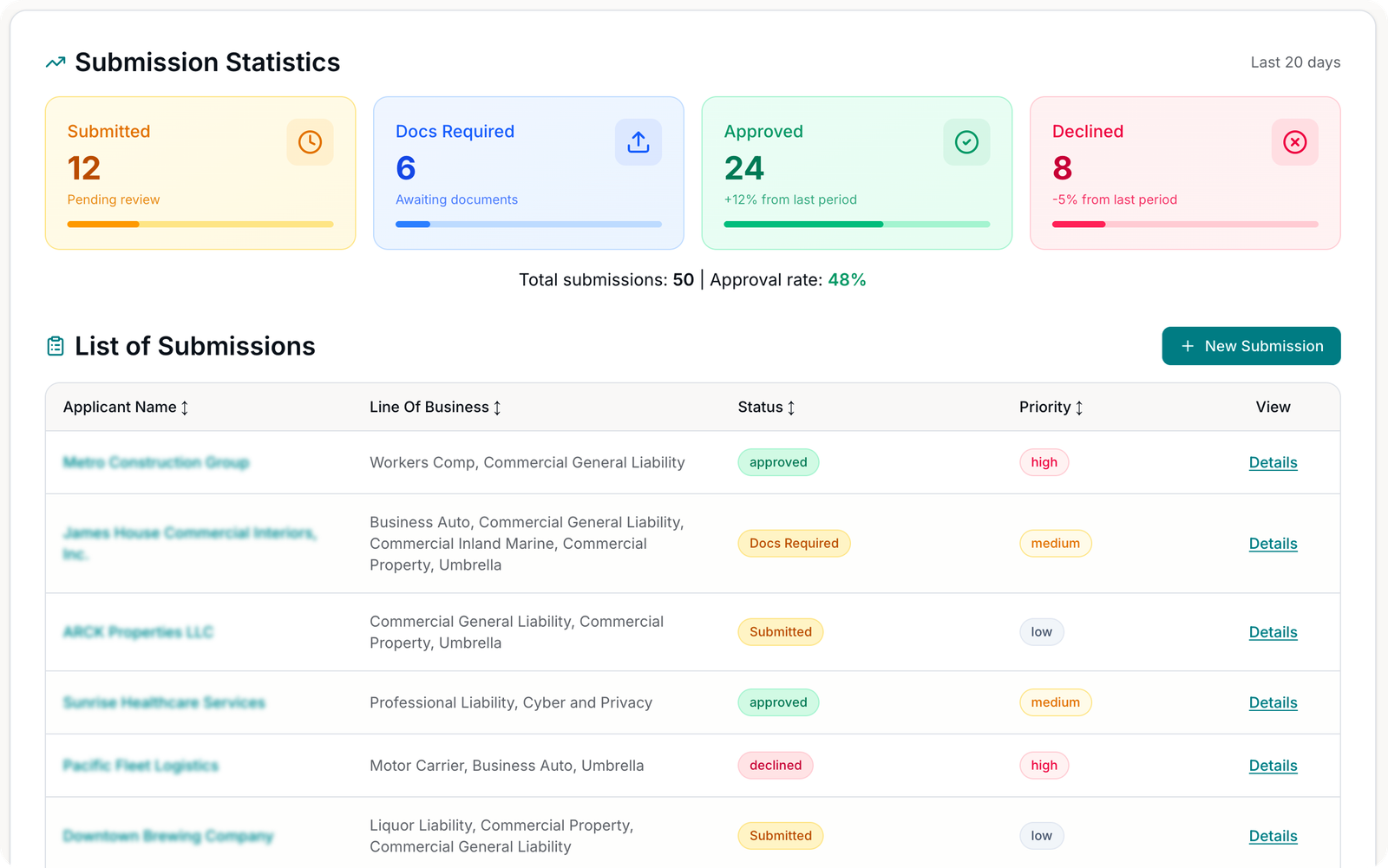 Gain real-time insights into submission volumes, processing times, approval rates, and agent performance with comprehensive dashboards.